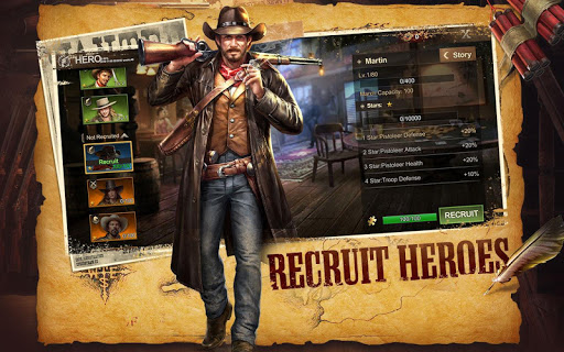 - Werbe einzigartige Helden aus dem Wilden Westen an, die deine Armee in den Kampf um Ruhm und Reichtum führen.