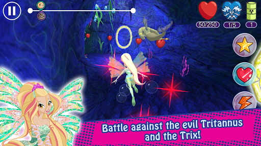 Schwimmen Sie durch die Säule der Kontrolle als Ihre Lieblingsfee und sammeln Sie so viele Herzen wie möglich, bevor Sie ausgehen, bevor die Zeit ausgeht! Rennen gegen Tritannus durch die Riffe und Höhlen, und vermeiden Sie Zaubersprüche der Trix! Sobald Sie Ihr Training abgeschlossen haben, können Sie Tritannus mit superstarke Zaubern einnehmen!