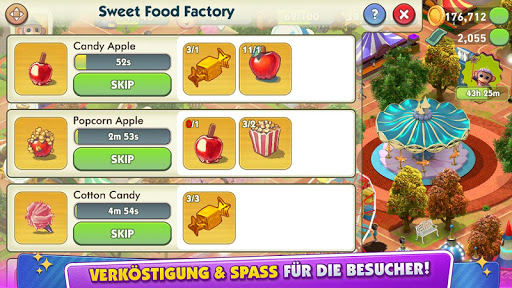 🍭FERTIGUNG: Auch die Süßigkeiten in deinem Park sind eine Attraktion. Beschaffe dir die Zutaten und bereite Popcorn, glasierte Äpfel, Eiscreme, Burger und mehr zu!