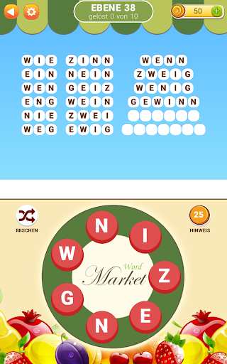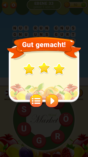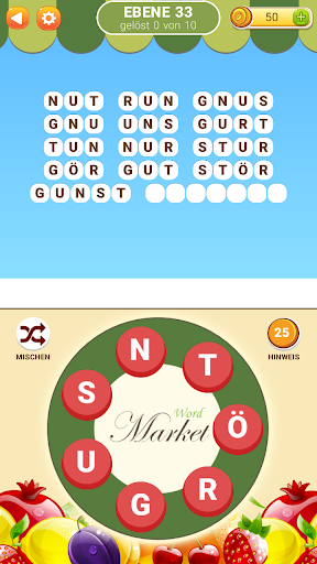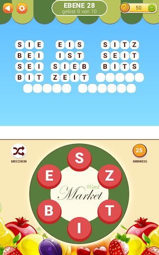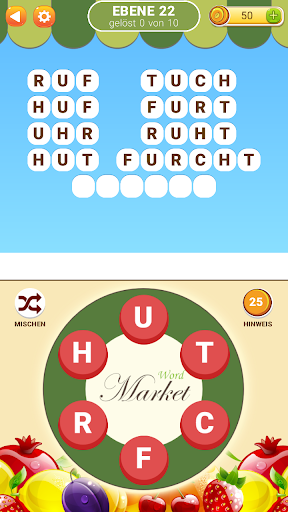 Zweites Spiel der beliebten Word Market Serie mit brandneuen Satz von Puzzles. Neu in diesem Spiel: Du kannst jetzt versteckte Wörter für extra Bonusmünzen einlösen. Wischen Sie mit dem Finger über die Buchstaben auf dem Teller, um ein Wort zu bilden und eine Frucht zu entriegeln. Äpfel, Erdbeeren, Orangen, Pflaumen ... Gesund! Erraten Sie alle Wörter, geben Sie Ihrem Gehirn einige Vitamine!