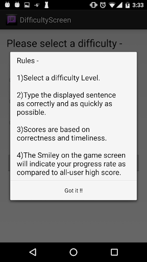The game involves typing English sentences of 3 different difficulty levels. Complete with your friends and yourself by typing the sentences as fast as possible. When you get a high score, take a selfie to remember the moment!