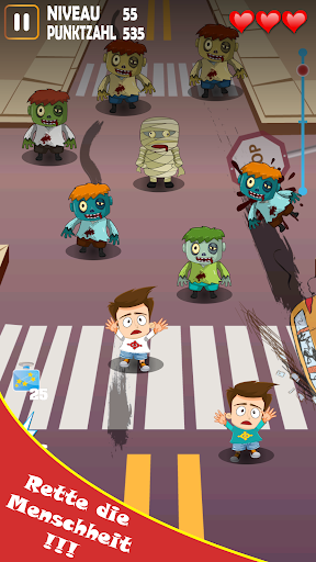 Um Menschen vor der Invasion von Zombies zu schützen. Klicke mit den Fingern auf die Zombies, um sie zu treffen und zu eliminieren, bevor sie durchgehen. Sie sind sehr überfüllt, also sei schneller Finger. Je höher das Level, desto schneller bewegen sich die Zombies. Und deine Finger müssen schneller sein. Es gibt spezielle Arten von Zombies, auf die du achten musst: Fat Zombie: Muss 10 Mal getroffen werden, um es zu töten. Zombie Teleport: Kann sich sofort bewegen. Es gibt auch Zombies, die mit Helmen ausgestattet sind. Sie müssen den Helm brechen, bevor Sie die Zombies töten. Und vergiss nicht, den Jungen nie zu berühren. Ihre Aufgabe ist es, ihn vor Zombies zu schützen. Wenn Sie ihn töten, verlieren Sie.