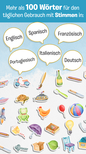 💟 Lernkarten: Audio von gezeichneten Wörtern in 6 Sprachen (Portugiesisch, Spanisch, Englisch, Französisch, Italienisch und Deutsch).