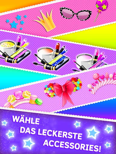 Ihr Modell braucht ein glänzendes Make-up, um den Look zu vervollständigen. Wählen Sie aus Tonnen bunten Lidschatten, Wimperntusche, saftigen Lippenstiften und vieles mehr! Und vergiss nicht, dass leckeres Zubehör ein Muss von dieser Saison ist! Glänzende Zuckerschmuck und animierte Tattoos verwandeln Ihr Modell in eine stilvolle Berühmtheit!
