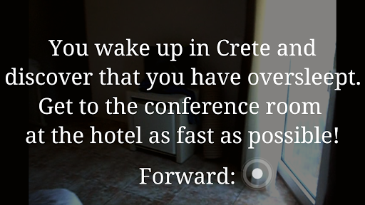 You wake up in Crete and discover that you have overslept. Get to the conference room at the hotel as fast as possible.