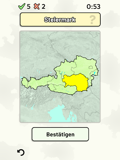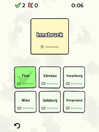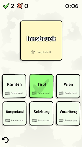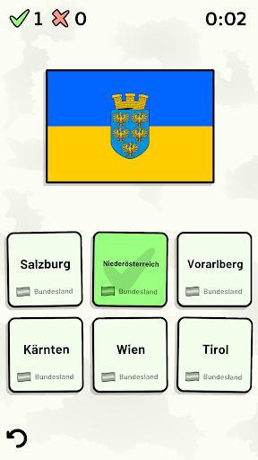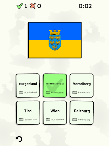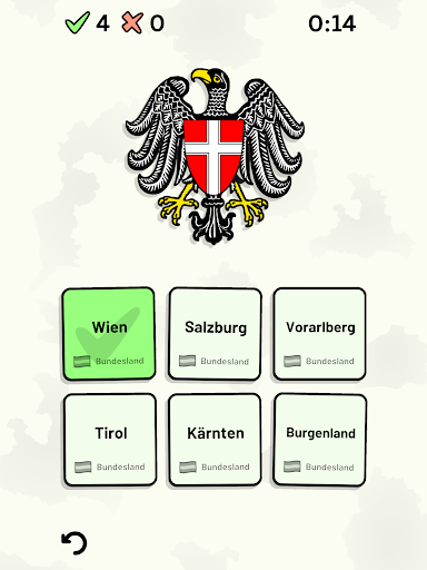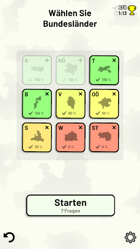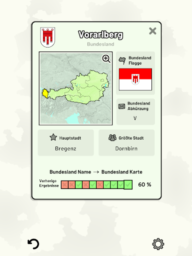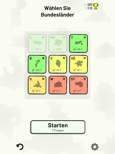 Anpassbare Quizfragen ermöglichen die Auswahl des Themas sowie der Bundesländer, die getestet werden sollen. Frühere Ergebnisse für jede Bundesländer werden angezeigt, um Ihre Fortschritte zu jedem Thema hervorzuheben.