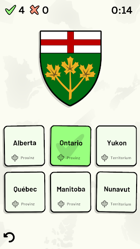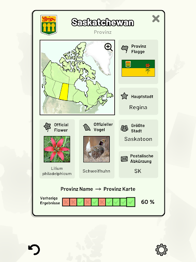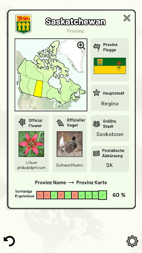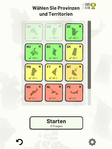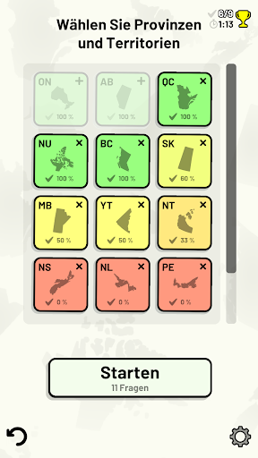 Anpassbare Quizfragen ermöglichen die Auswahl des Themas sowie der Provinzen und Territorien, die getestet werden sollen. Frühere Ergebnisse für jede Provinz und jedes Territorium werden angezeigt, um Ihre Fortschritte zu jedem Thema hervorzuheben.