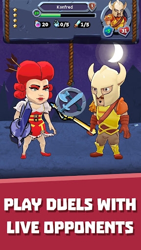 Statte den Helden mit 5 Waffen aus und auf in den Kampf. Du wirst den Helden deines Gegners in seiner vollen Schönheit sehen, du wirst von Angesicht zu Angesicht gegen ihn kämpfen und die Kämpfe sind live, voller Animationen und Emotionen. Kämpfe in realtime Kämpfen gegen deine Gegner, gewinne Pokale und kämpfe um Platzierungen in der Liga oder nimm Aufforderungen zu einem Duell mit einem konkreten Freund an. Steuere die Strategie und finde einen Kampfstil, der zu dir passt.