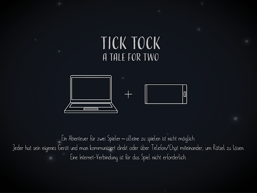 "Tick Tock: A Tale for Two" ist ein unheimliches kooperatives Puzzlespiel für zwei Spieler. Jeder Spieler benötigt eine Kopie des Spiels auf seinem eigenen Device (Telefon oder Tablet), um spielen zu können.