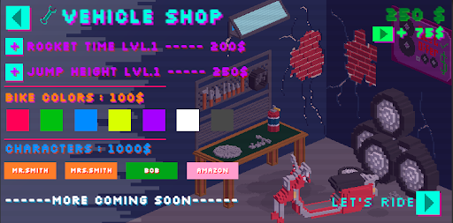 Take a ride with different characters and colored motors, do some upgrades and make the game more fun. This game is still in progress so there maybe some bugs in game, but I working on it. Hope you ejoy the game.