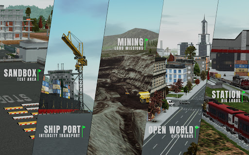 Erkunden Sie eine realistische offene Welt mit herausfordernden Straßen und Offroad-Strecken, tauchen Sie in die tiefen Minen ein, entdecken Sie die Großstadt, den Hafen, den Bahnhof, Einkaufszentren, Lagerhäuser und viele kundeneigene private Bereiche und Grundstücke.