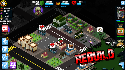 Sie können Bürger rekrutieren und aufheben, indem Sie sie mit dem Essen füttern. Bürger erzeugen Nahrung und Materialien, auch wenn Sie untätig oder offline sind. Die Materialien, die sie sammeln, können zum Bau von Gebäuden verwendet werden, um andere Gegenstände zu bauen. Wählen Sie Ihre eigene Strategie, um herauszufinden, welche Gebäude Ihre Bürger am meisten benötigen. Wählen Sie aus, welchen Jobs zu tun, und suchen Sie nach Bereichen, um zu erkunden. Baue neue Gebäude in deiner Stadt, um zu helfen, die Untotenhorde zu bekämpfen.