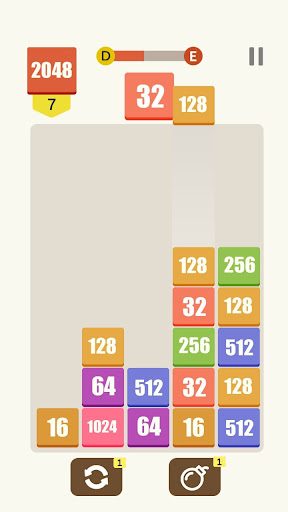 In diesem Spiel haben Sie endlose fallende Blöcke mit Zahlen von 2 bis 1024. Jedes Mal, wenn Sie den Pool mit einem neuen Block füllen müssen.Jeder Block mit der gleichen Zahl in der Nähe wird mit größerer Anzahl zu einem Block verschmelzen.