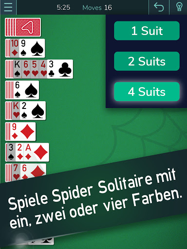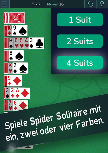 Du kannst Spider Solitaire kostenlos spielen und bei der Auswahl deines Spiels zwischen vier, zwei oder einer Farbe wählen. Hab Spaß mit einem der besten Kartenspiele aller Zeiten.
