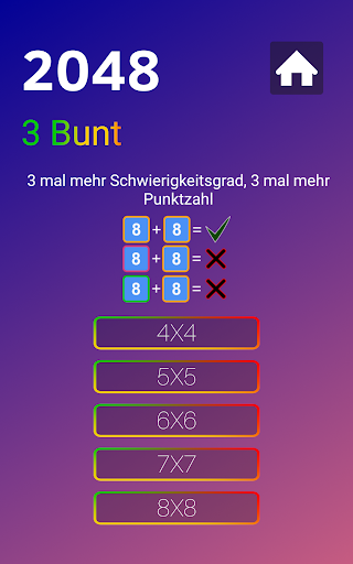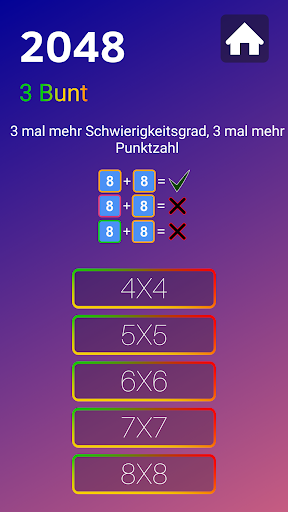 Es gibt 3 farbenfrohe, 2 farbenfrohe und klassische Optionen mit fünf Schwierigkeitsstufen, einschließlich 4x4, 5x5, 6x6, 7x7 und 8x8 in der 2048 farbenfrohen