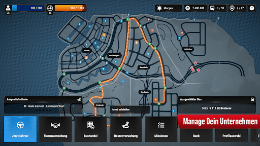 Zeige deine Fahrkünste: Schaffe es nach ganz oben und baue ein erfolgreiches Busunternehmen auf. Im Verlauf der Kampagne kannst Du mehr Busse, Stadtteile und Routen freischalten. Baue ein größeres Verkehrsnetz auf, fahre Routen ab, um mehr Credits zu verdienen, kaufe neue Busse und bringe sie alle auf Deinen Routen zum Einsatz. Der Erfolg des Unternehmens liegt in DEINEN HÄNDEN!