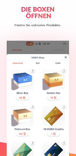 Öffnen Sie virtuelle Boxen mit bis zu 4 Levels, eins besser als das andere. Finden Sie die Gegenstände mit dem seltensten MOD-Level, bereichern Sie Ihre Garderobe im Spiel und entdecken Sie, ob Sie der oder die Glückliche sind, der die raffiniertesten MOD4-Artikel in die Hände bekommt!