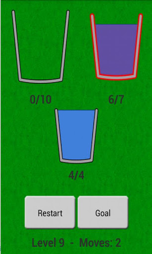 Eimer Master ist ein Puzzlespiel, in dem das Ziel besteht, Wasser zwischen Eimer zu gießen, um bestimmte Wassermengen zu erhalten.Sie können entweder jeden Eimer von einem Teich mit so viel Wasser füllen, da es möglicherweise einen Eimer enthalten oder leeren kann.Außerdem können Sie Wasser von einem Eimer zu einem anderen gießen, bis der zweite Eimer voll ist.Sie wissen, wie viel Wasser Sie Eimer enthalten können.Es liegt an Ihnen, herauszufinden, wie Sie andere Wassermengen messen können!