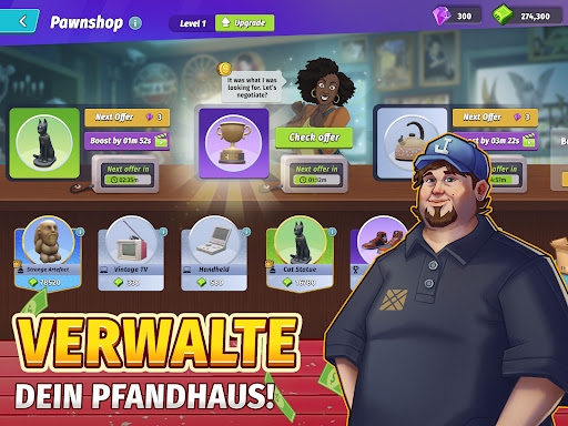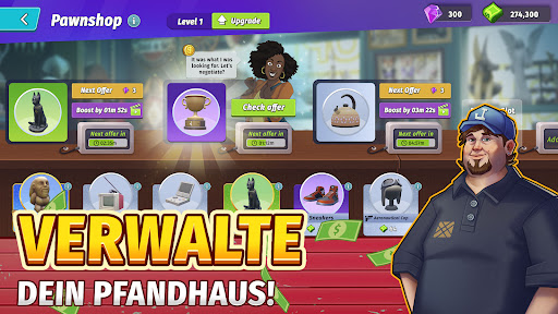 Erlebe den Rausch des strategischen Bietens in Lagerauktionen wie im Fernsehen, wenn du in Auktionen nach wertvollen Schätzen suchst! Jede neue Lagereinheit ist eine Gelegenheit, verborgene Schätze zu entdecken, die du für einen saftigen Gewinn verkaufen kannst. Biete gegen die besten Schatzsucher, um deine Konkurrenten auszustechen, dir die besten Angebote zu sichern, Schätze zu sammeln und dein Pfandhaus in dieser Stadtbau- und Verhandlungsspielreise aufzubauen!