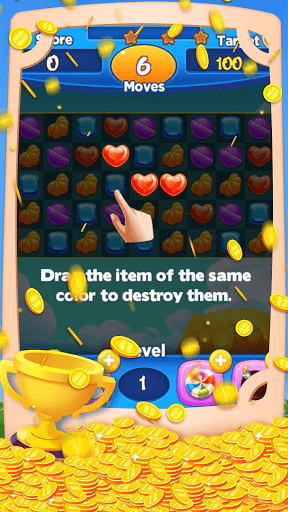 Zerstöre das Gelee der gleichen Farbe, um Scores zu bekommen.Wenn Sie den Zielwert erreichen, können Sie die nächste Ebene freischalten, also versuchen Sie, einen hohen Punktzahl zu erhalten, und versuchen Sie, 3 Sterne zu erhalten.