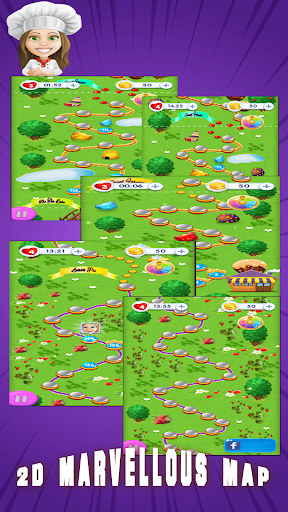 Advance in a beautiful world full of candy snacks. Join this sweet journey and enjoy a variety of sweet treats, including chocolates, ice cream, cakes, doughnuts and more.