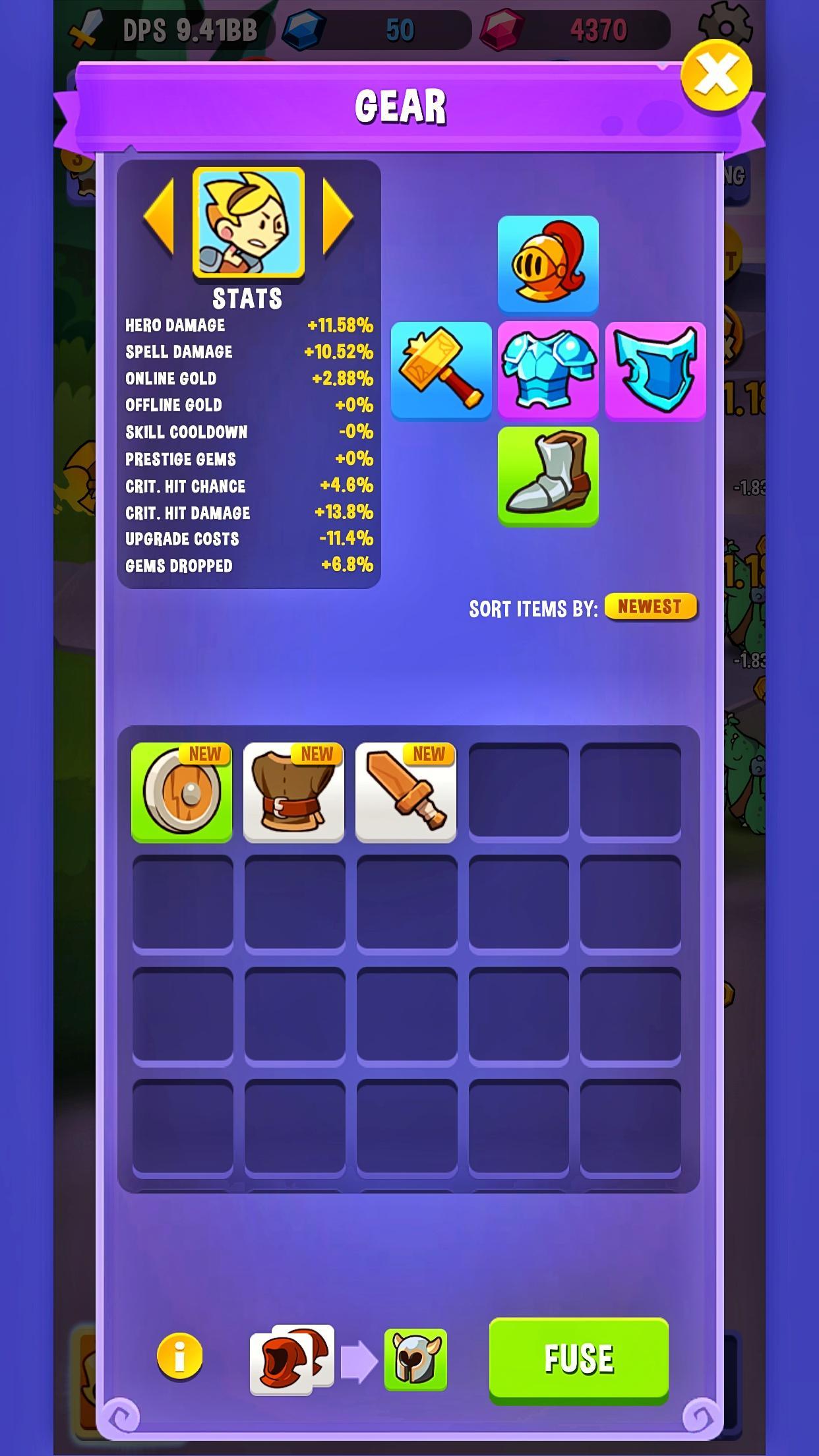 - Trinkets (Unlocked in stage 60): Collect them, equip them on heroes to boost their stats and level them up with crystals