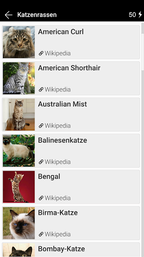 Sie können den Rassenkatalog verwenden und lernen. Jede Zuchtkarte enthält ein Foto, einen Namen und einen Link zu einer Wikipedia-Seite.