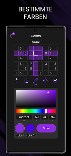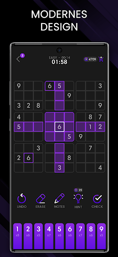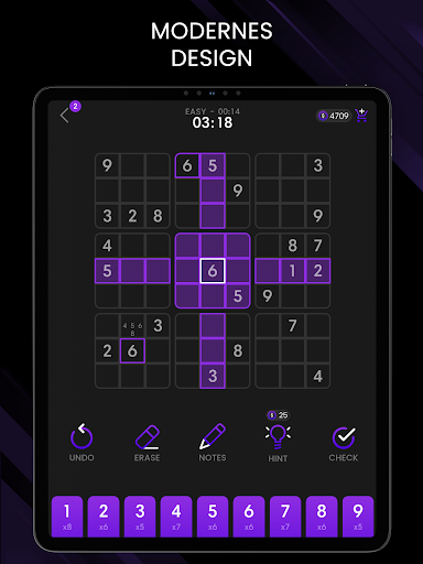 - Automatisches Entfernen von Notizen aus allen Spalten, Reihen und Blöcken, sobald die Zahl platziert wurde und auch unbegrenztes Rückgängigmachen