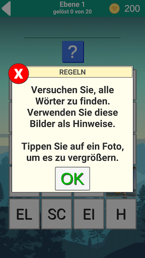 Auf jeder Ebene stehen Ihnen 20 Bilder zur Verfügung ,mit denen Sie 20 verborgene Wörter erraten müssen, um den Level zu beenden. Fotos werden abwechselnd geöffnet, Sie haben eine bestimmte Anzahl von Fotos zur Verfügung, wie Sie erraten, welche andere zur Verfügung stehen. Das Spiel ist in 7 Sprachen verfügbar: Englisch, Russisch, Spanisch, Italienisch, Portugiesisch, Deutsch, Französisch.