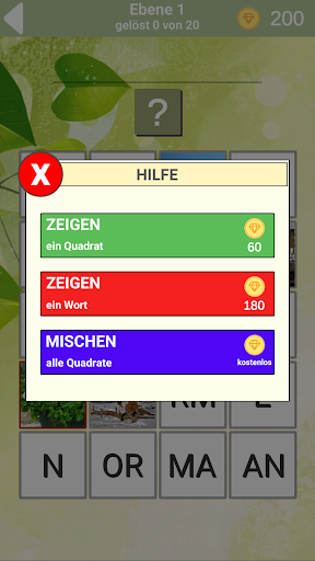 Auf jeder Ebene stehen Ihnen 20 Bilder zur Verfügung ,mit denen Sie 20 verborgene Wörter erraten müssen, um den Level zu beenden. Fotos werden abwechselnd geöffnet, Sie haben eine bestimmte Anzahl von Fotos zur Verfügung, wie Sie erraten, welche andere zur Verfügung stehen. Das Spiel ist in 7 Sprachen verfügbar: Englisch, Russisch, Spanisch, Italienisch, Portugiesisch, Deutsch, Französisch.