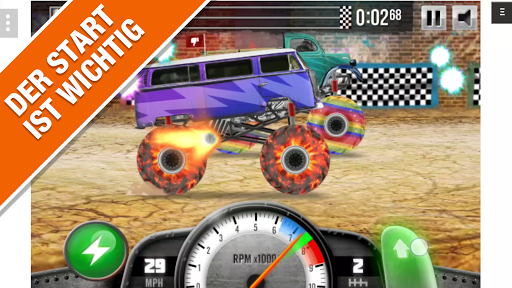 In diesem Beschleunigungsrennen geht es um nichts anderes als um perfektes Timing. Wenn Du an der Startlinie stehst, halte die Drehzahl exakt im grünen Bereich bis die Ampel umspringt. Nur dann reißt es deinen Monster Truck aus den Startblöcken wie von einem Katapult geschossen. Und damit du bis zur Ziellinie vorne bleibst, gilt es nun mindestens genauso exakt zu schalten. Du musst den nächsten Gang immer genau dann einlegen, wenn der Drehzahlmesser den sehr schmalen grünen Abschnitt erreicht. Wenn du das schaffst, dann schiebt dein Monster Truck dich weiterhin vehement nach vorne. Wenn du daneben liegst, lässt die Beschleunigung nach.
