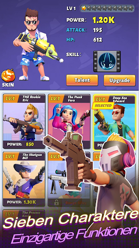 Schließe Levels ab und schalte neue spielbare Charaktere frei. Jeder Charakter verfügt über einzigartige Fähigkeiten und Spezialwaffen. Werde immer stärker, indem du Talente verbesserst. Sie helfen dir jeden zu vernichten, der dir in die Quere kommt.