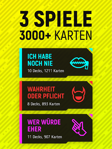 Ich habe noch nie ist ein perfektes Spiel, um mit Freunden und Fremden gespielt zu werden. Du findest sexy, verrückte, schmutzige, witzige Details über deine Freunde heraus und lernst Fremde mit einer sehr hohen Geschwindigkeit kennen. Die Regeln sind einfach: