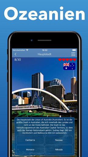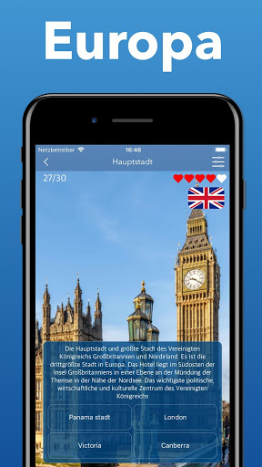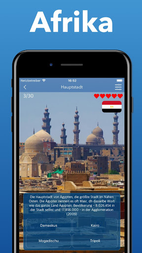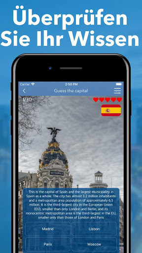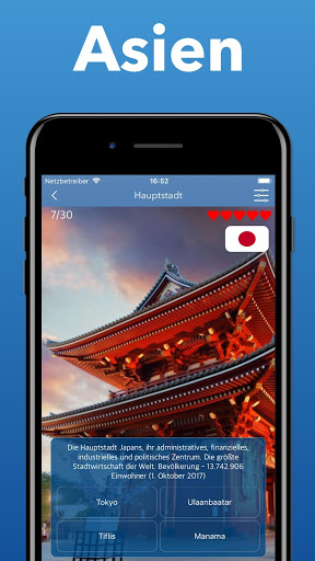 Kennen Sie die Hauptstädte europäischer Länder? Die Hauptstädte Afrikas oder Asiens? Wissen Sie, dass Oslo die Hauptstadt und größte Stadt Norwegens ist und Warschau die Hauptstadt und größte Stadt in Polen? Mit dieser kostenlosen Anwendung über Geographie können Sie alle Städte der Hauptstadt aller Länder der Welt kennenlernen! Testen Sie Ihre geografischen Kenntnisse! Erraten Sie die Hauptstädte aller Länder der Welt!
