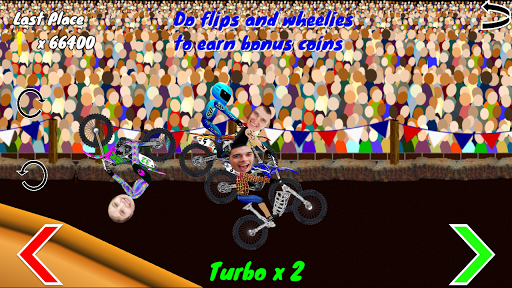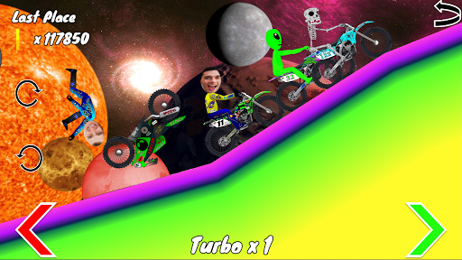 Motorrad Gesichtsrennen bringt Ihnen Kreativität, Innovation und rohe Adrenalin Rennaktion, in den Mischer mit einer Seite der Komödie geworfen, die dazu führt, dass Sie real lol sind. Dieses für alle Altersgruppen angemessen ist dieses Bike Racing-Spiel an alle unendlichen Unterhaltung. Holen Sie sich große Luft von Monster Sprüngen. Ziehen Sie Flips und Tricks ab, um das wunderbare Cha-Ching von Bonusmünzen zu hören. Verwenden Sie Ihre Münzen, um neue Rennstrecken freizuschalten und Ihre Fahrräder aufzurufen. Wähle aus einer großen Kollektion von Dirt-Bikes, Choppern und Straßensporträdern. Gehen Sie in einem farbenfrohen Sortiment an lebendiger Rennausrüstung an oder wählen Sie sogar, dass Sie als einklatschendes Skelett oder glühendes Alien rennen. Die Möglichkeiten sind nur durch Ihre Fantasie begrenzt!