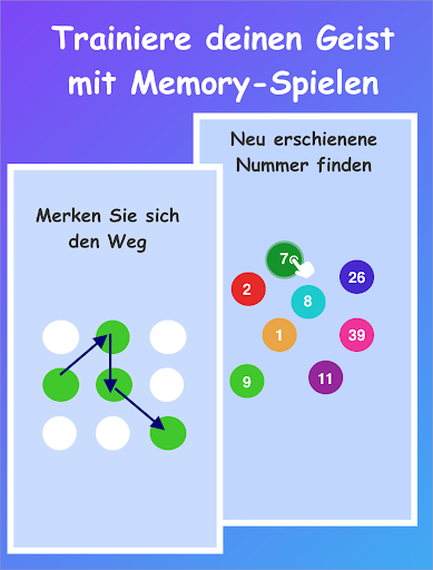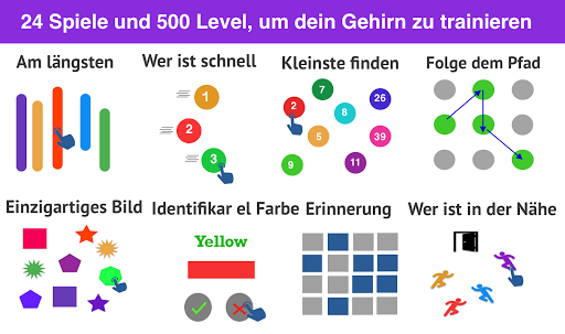 Verbessern Sie Ihre Gedächtnisfähigkeiten mit vielen Gehirntrainingsspielen und wählen Sie aus mehreren Kategorien wie Genauigkeit, Aufmerksamkeit, Gedächtnis und Problemlösung.