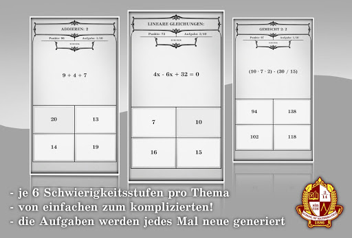 Ausser dem vorlaeufigen Vortschrift, kannst du im Spiel mit Funktion "Schnelles Training" ueben. In diesem Modus wirst du Matheaufgaben aus verschiedene Themen loesen. Trainiere, verbessere dein Denkvermoegen, werde noch schlauer!
