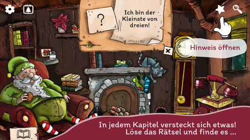 Folge den Hinweisen und finde den versteckten Gegenstand in jedem Bild, um das Wohnzimmer des Weihnachtsmanns einzurichten.