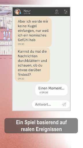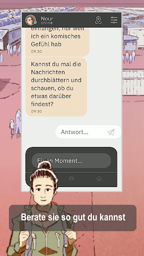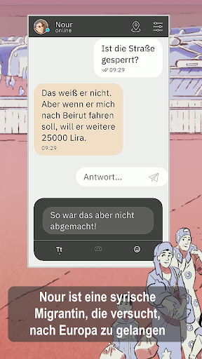 Du kommunizierst als Majd mit Nour und begleitest sie auf ihrer Reise. Euer Austausch findet wie über Messaging App statt. Ihr werdet Nachrichten, Emojis, Bilder, Selfies und wichtige Links miteinander austauschen…