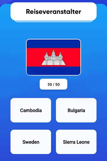 Wie viele Flaggen der Welt kennst du? In der modernen Welt, in der wir ohne Grenzen reisen können, ist das Grundwissen über Geografie und Länderflaggen von größter Bedeutung. Unsere kostenlose Flaggen der welt & Länder Quiz App wird Ihnen helfen, sich die Länder, Hauptstädte und Flaggen einzuprägen, damit Sie nie wieder Frankreich und die Niederlande verwechseln. Die Flaggen der welt & Länder Quiz App enthält alle 196 Länder der Welt. Wir haben hart daran gearbeitet, diese Flaggen der welt & Länder Quiz App unterhaltsam und effektiv zu gestalten.