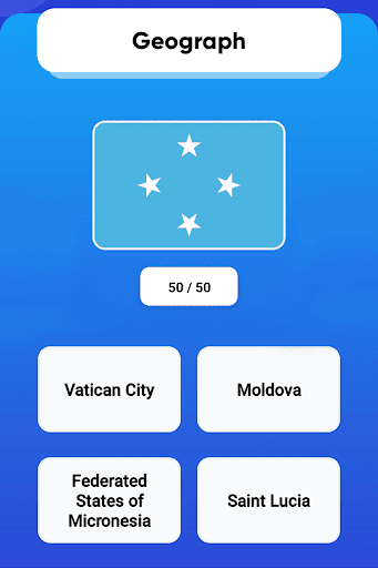 Wir haben der Flaggen der welt & Länder Quiz App auch verschiedene Arten von Hinweisen hinzugefügt, um es dir leichter zu machen, die schwierigen Phasen des Spiels zu meistern. Du findest die folgenden Arten von Hinweisen in der App: eine falsche Option entfernen, zwei Optionen entfernen oder die richtige Antwort anzeigen. Für jedes vollständig abgeschlossene Level von Flaggen der welt & Länder Quiz erhältst du eine Bonusmünze.