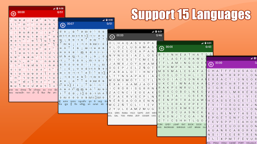 ខ្មែរ (Khmer), ไทย (Thai), Dansk, Deutsch, English, Español, Français, Italiano, Nederlands, Norsk, Polski, Portuguese, Suomi, Svenska, and Türkçe are languages include in Word Search.