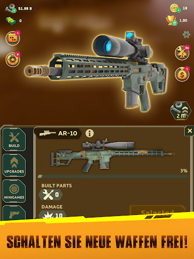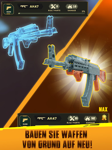Auf Ihrer Reise durch den Waffenbau werden Sie zwei Arten von Erfahrungen machen: Bauen und Schießen. Beim Bauen können Sie Ihre Traumwaffe kreieren, indem Sie verschiedene Komponenten wie Läufe, Schäfte, Magazine und Visiere hinzufügen. Je mehr Komponenten Sie hinzufügen, desto stärker werden Ihre Waffen! Schrotflinte, Glock-Pistole, Magnum, AK47... Egal für welches Modell Sie sich entscheiden, Ihre Träume als Waffenbauer können wahr werden!
