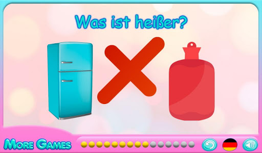 Im Spiel "Kalt heiss" kann das Kind die Fertigkeiten der Bestimmung der Temperatur ohne Berührung zu den Gegenständen zu verbessern. Auf jedem Niveau aus zwei Darstellungen der Gegenstände muss man wählen, was gewöhnlich heiss oder sind, was kälter sind. Später werden 15 Niveaus, in Form von der Gratulation für das Kind die Luftkugeln auffliegen, die man vom Finger reißen kann.
