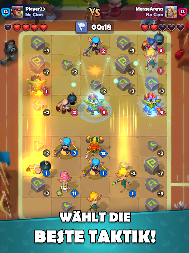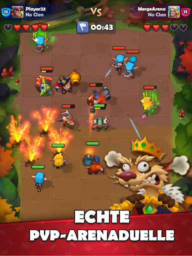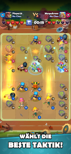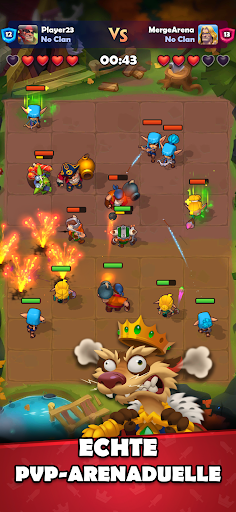 Krieger! Willkommen bei Merge Arena! Nehmt an blitzschnellen Kämpfen teil, verteidigt im PvP gegen andere Spieler eure Armee in Echtzeit! Genießt dieses einmalige Fusionsspiel! Baut ein Deck mit Helden, macht es unglaublich stark, verteidigt euren Trupp, gewinnt Schlachten, besiegt Armeen aus aller Welt und zeigt im PvP allen, wer der Stärkste ist!
