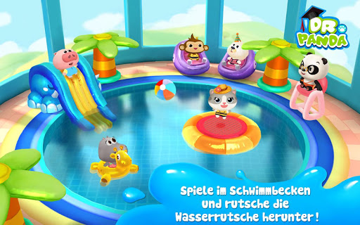 Plansche und spiele mit fünf Tierbabys in Dr. Pandas Schwimmbad! Es gibt drei große Schwimmbecken zum hineintauchen und fünf Tiere zum aufpassen für pausenlosen Spaß. Wähle dein Outfit aus, genieß einen Snack am Beckenrand, rutsche die Wasserrutsche herunter und tauche von einem Piratenschiff ab auf der Suche nach dem versteckten Schatz!