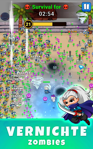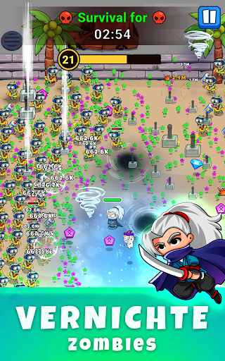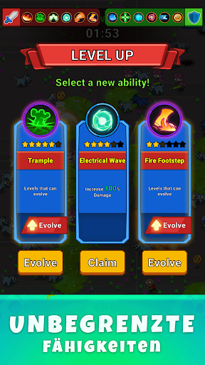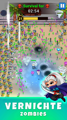 Die Zahl der Feinde ist enorm. Kämpfe, während du Mana sammelst, um deine Fähigkeiten freizuschalten und zu verbessern. Zerstöre sie, indem du Tausende von Monstern gleichzeitig bekämpfst! Löschen Sie die Karte mit nur einer Hand!