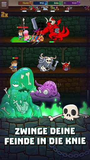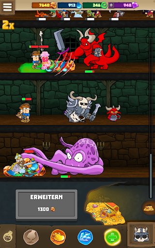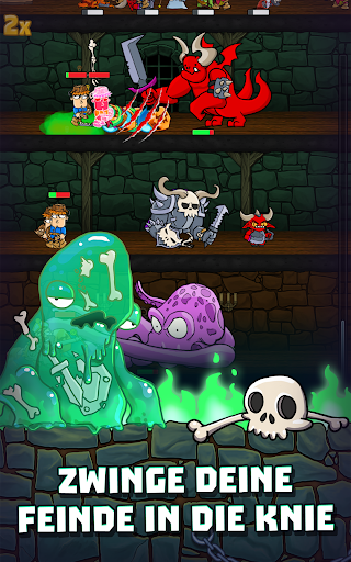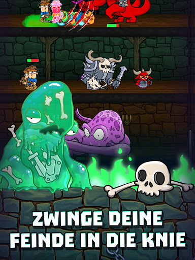 Beim Kampf um den Schatz kannst du in diesem Idle Game auch Spezialeffekte bei der Verteidigung anwenden, wie Gift oder Feuer, was deine Gegner langsam niederstreckt. Manche Monster können die Helden verlangsamen und sogar lähmen oder ihnen so viel Angst einjagen, dass sie gleich wieder ein Stückchen zurückweichen.