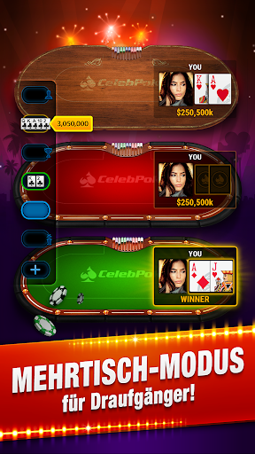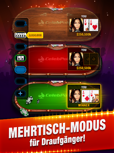 Celeb Poker ist ganz einfach die spannendste soziale Poker-App im Internet! Wir haben alles, was viele andere nicht anbieten: