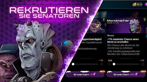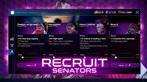 Xterium bietet auch ein Modernisierungszentrum, in dem Sie Ihr Kriegsschiffhandwerk und Ihre Verteidigung verbessern können, indem Sie Verträge abschließen und Ihre Flotte zu einer einzigartigen Überarbeitung schicken. Talentierte Handwerker können je nach Ihrer Strategie neue Arten von Kampfwaffen zu vorgefertigten Schiffen hinzufügen, die Wiederherstellung von Schilden erhöhen oder ein Doppelschuss- und Schildmodul hinzufügen. Um die Kampfkraft Ihres Raumschiffs zu erhöhen, studieren Sie Angriff, Panzerung und Schilde.
